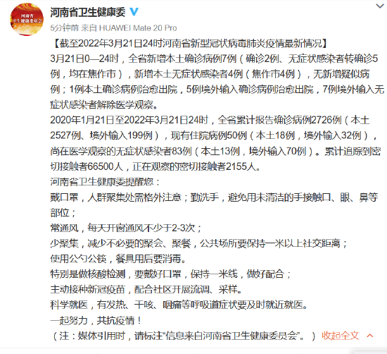3月21日0—24時,全省新增本土確診病例7例(確診2例、無癥狀感染者轉確診5例,均在焦作市),新增本土無癥狀感染者4例(焦作市4例),無新增疑似病例;1例本土確診病例治愈出院,5例境外輸入確診病例治愈出院,7例境外輸入無癥狀感染者解除醫學觀察。