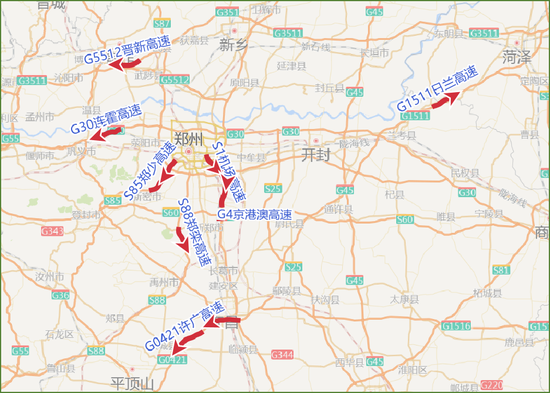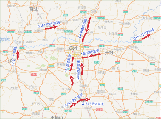 鄭州至焦作、新鄉方向:鄭云高速、京港澳高速鄭州段。