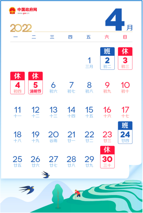 根據國務院辦公廳通知精神,2022年清明節放假安排如下:4月3日(星期日)—4月5日(星期二)放假調休,共3天。4月2日(星期六)上班。清明節3天假期鄭州市三環以內機動車不限行。