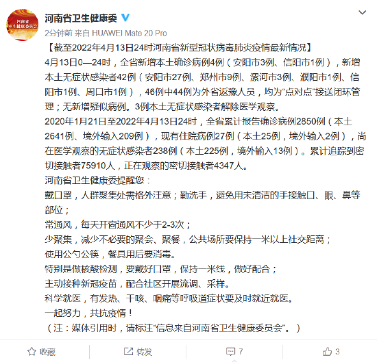 [截至2022年4月13日24時(shí)河南省新型冠狀病毒肺炎疫情最新情況]4月13日0—24時(shí),全省新增本土確診病例4例(安陽(yáng)市3例、信陽(yáng)市1例),新增本土無(wú)癥狀感染者42例(安陽(yáng)市27例、鄭州市9例、漯河市3例、濮陽(yáng)市1例、信陽(yáng)市1例、周口市1例),46例中44例為外省返豫人員,均為“點(diǎn)對(duì)點(diǎn)”接送閉環(huán)管理;無(wú)新增疑似病例。3例本土無(wú)癥狀感染者解除醫(yī)學(xué)觀察。