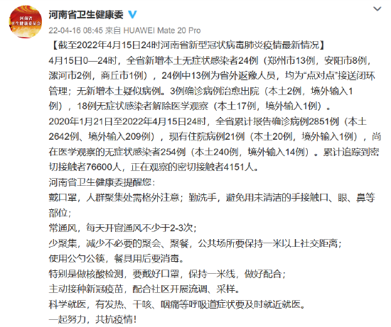 [截至2022年4月15日24時河南省新型冠狀病毒肺炎疫情最新情況]