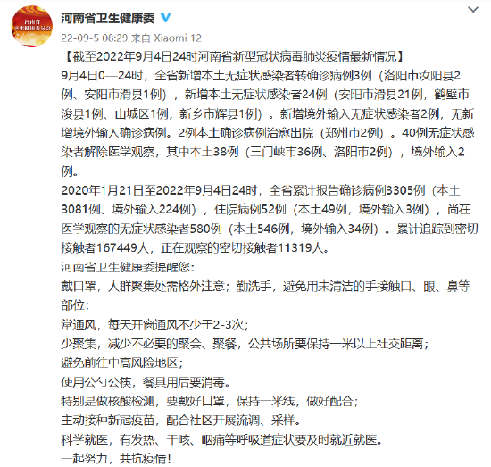 [截至2022年9月4日24時河南省新型冠狀病毒肺炎疫情最新情況]