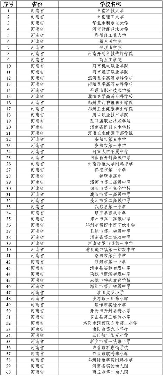 其中,河南科技大學、河南理工大學、華北水利水電大學、河南財經政法大學等60所大中小學校入選。
