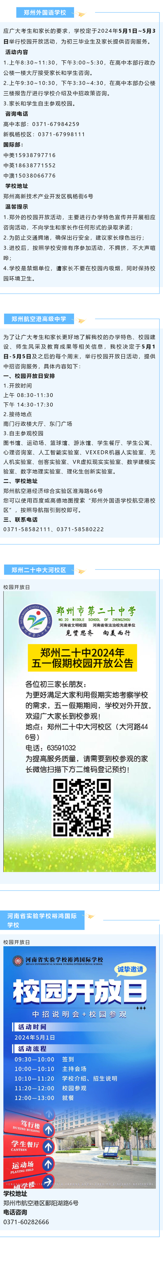 為進(jìn)一步加強(qiáng)家校聯(lián)系,增進(jìn)社會各界對學(xué)校辦學(xué)理念及教育特色的了解,五一前夕,鄭州外國語學(xué)校等多所學(xué)校發(fā)布通知,進(jìn)行校園開放日活動。